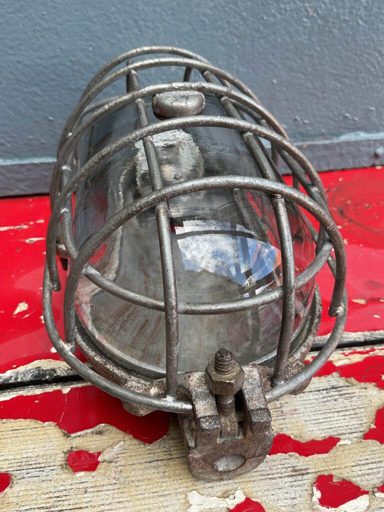 Alter Hallenscheinwerfer, hat Abplatzungen am Emaill, und ein gewölbtes Glas.