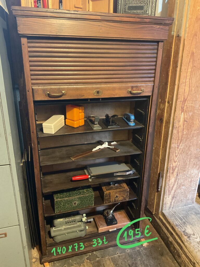 Aus einem alten Bahnhof, ca.120 Jahre alt, nimmt 11 Fachböden auf, geeignet für DIN A4, absoluter Originalzustand, Rolladen läuft gut.
